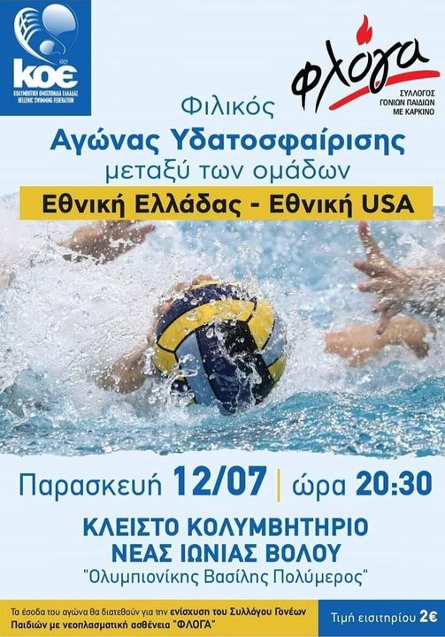 Ο αγώνας που θα διεξαχθεί μεταξύ της Εθνικής ομάδας και αυτής των Η.Π.Α θα έχει ξεχωριστό χαρακτήρα καθώς πέραν της παρουσίας των Βολιωτών που αναμένεται να κατακλείσουν το κολυμβητήριο, τα έσοδα θα διατεθούν για τη ΦΛΟΓΑ, τον σύλλογο γονέων παιδιών με νεοπλασματική ασθένεια.