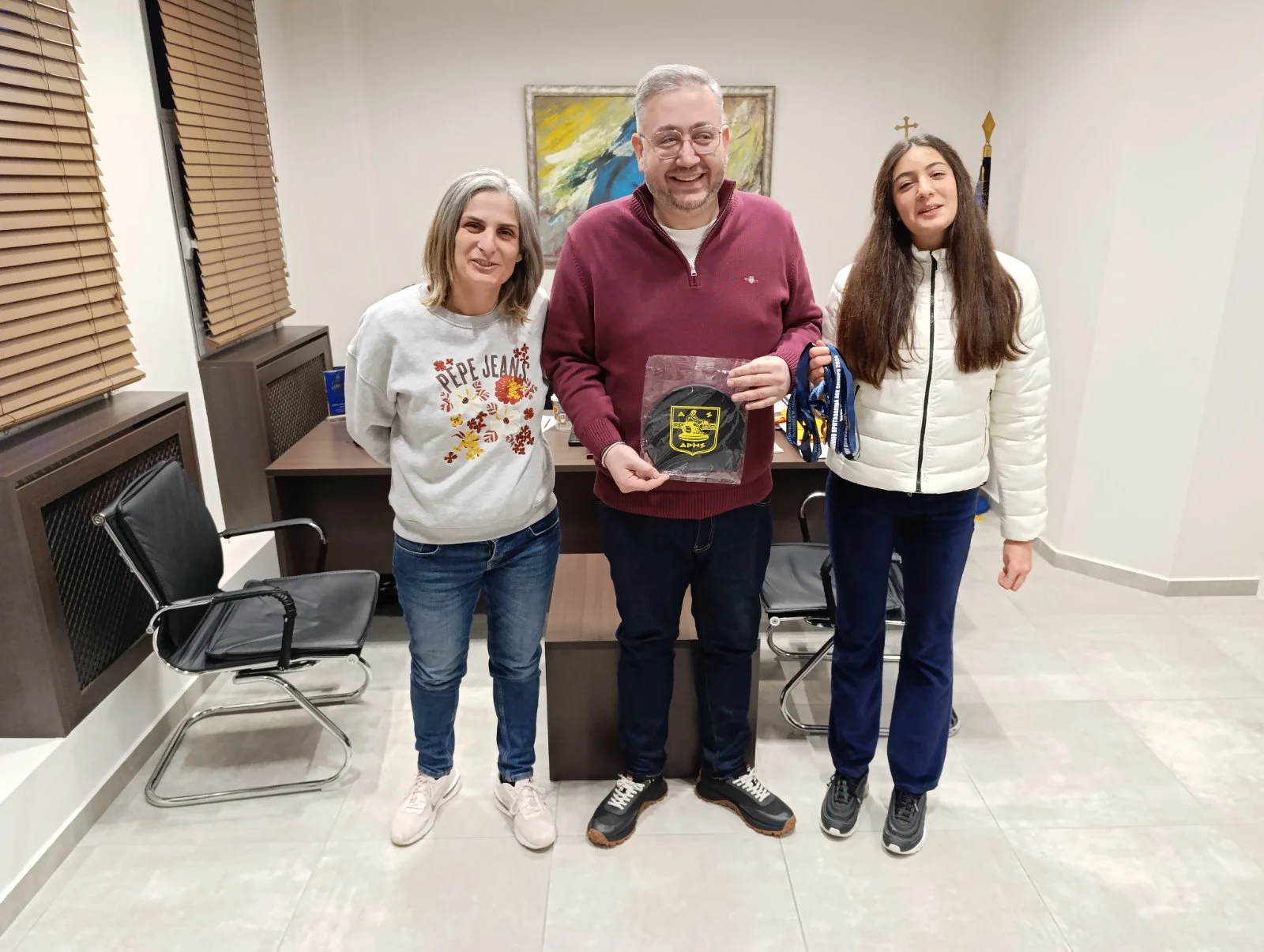 Σε ένδειξη εκτίμησης για τη στήριξη του Δήμου στον αθλητισμό, η ομάδα της αθλήτριας πρόσφερε στον Δήμαρχο ένα αναμνηστικό σκουφάκι.