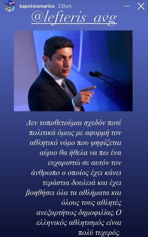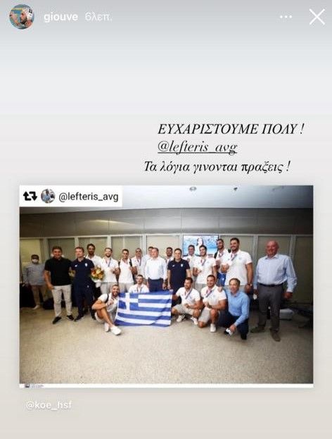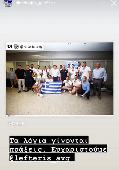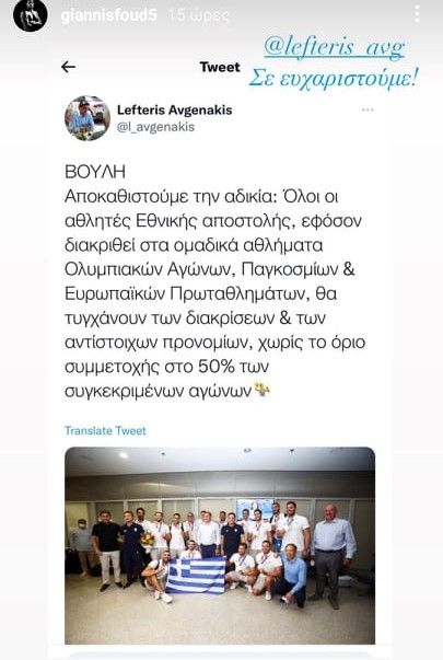 “ Ευχαριστούμε την κυβέρνηση και τον κύριο Λευτέρη Αυγενάκη για την πρωτοβουλία της τροπολογίας στο νέο αθλητικό νόμο, ώστε να προβλέπεται η αναγνώριση του εν ενεργεία εφέδρου, όχι μόνο στους Ολυμπιονίκες ατομικών, αλλά και σε αυτούς των ομαδικών αθλημάτων. Ηταν κάτι που είχε δεσμευτεί να το κάνει με την επιστροφή μας από το Τόκιο και το υλοποίησε άμεσα”, αναφέρει η δήλωση των παικτών της εθνικής ομάδας, η οποία δημοσιεύτηκε στα social media του Συνδέσμου Ελλήνων Αθλητών Υδατοσφαίρισης (ΣΕΑΥ).