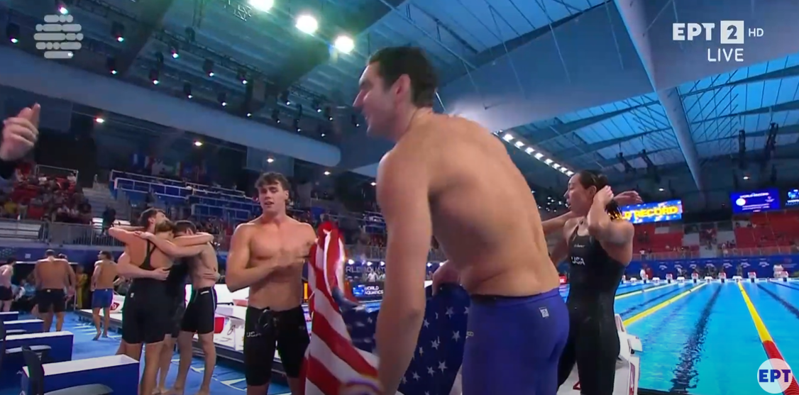 Η ομάδα των ΗΠΑ (Jack Alexy, Patrick Sammon, Kate Douglass, Torri Huske) έσπασε το Παγκόσμιο Ρεκόρ με το απίστευτο 3:18.48, ρίχνοντας από την κορυφή την Αυστραλία και το 3:18.83 του 2023.