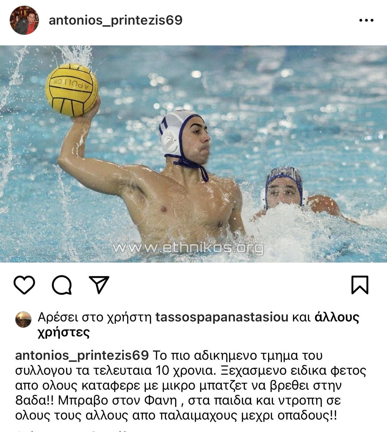 «Το πιο αδικημένο τμήμα του συλλόγου τα τελευταία 10 χρόνια. Ξεχασμένο ειδικά φέτος  από όλους κατάφερε με μικρό μπάτζετ να βρεθεί στην 8αδα! Μπράβο στον Φάνη, στα παιδιά και ντροπή σε όλους τους άλλους από παλαίμαχος μέχρι οπαδούς!