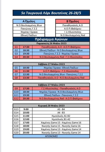 Στις 26 με 28 Μαΐου θα διεξαχθεί στο κολυμβητήριο του Ναυτικού Ομίλου Βουλιαγμένης το 5ο τουρνουά Εφήβων, στη μνήμη του πρόωρα χαμένου αθλητή του, Λόρι Βουτσίνου.
