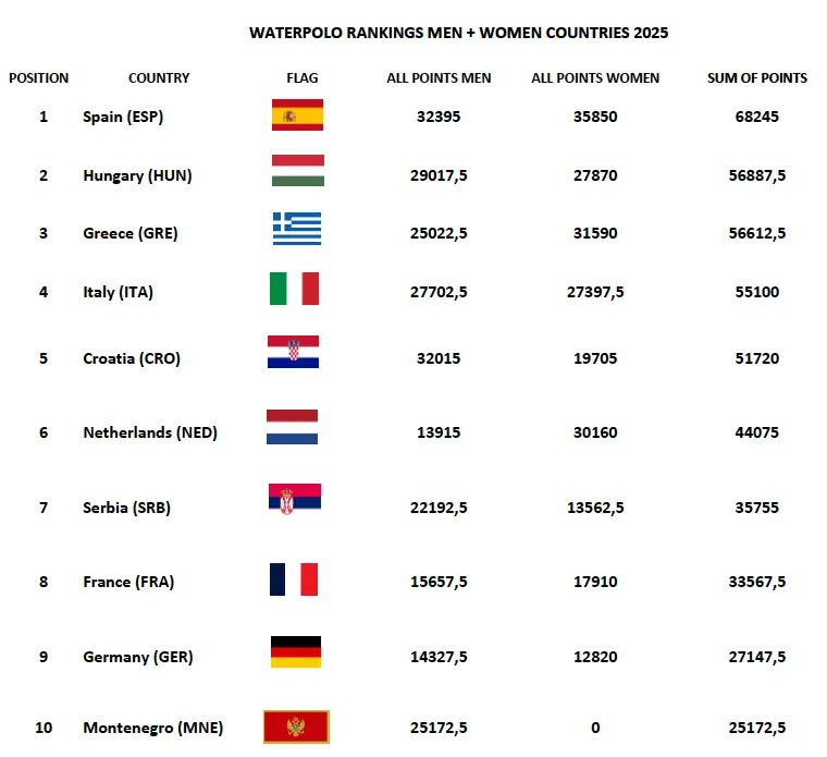 Η European Aquatics δημοσίευσε τη νέα κατάταξη των εθνικών ομάδων υδατοσφαίρισης, που βασίζεται στα αποτελέσματα των τελευταίων δύο ετών στα ευρωπαϊκά πρωταθλήματα ανδρών, γυναικών και ηλικιακών κατηγοριών.