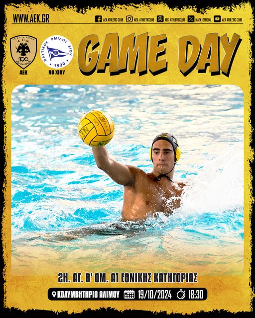 Εντός έδρας δοκιμασία για την ανδρική ομάδα Υδατοσφαίρισης της ΑΕΚ, που φιλοξενεί στο Κολυμβητήριο του Αλίμου το Σάββατο (19/10, 18:30) τον ΝΟ Χίου, για την 2η αγωνιστική του Β’ Ομίλου της Α1.