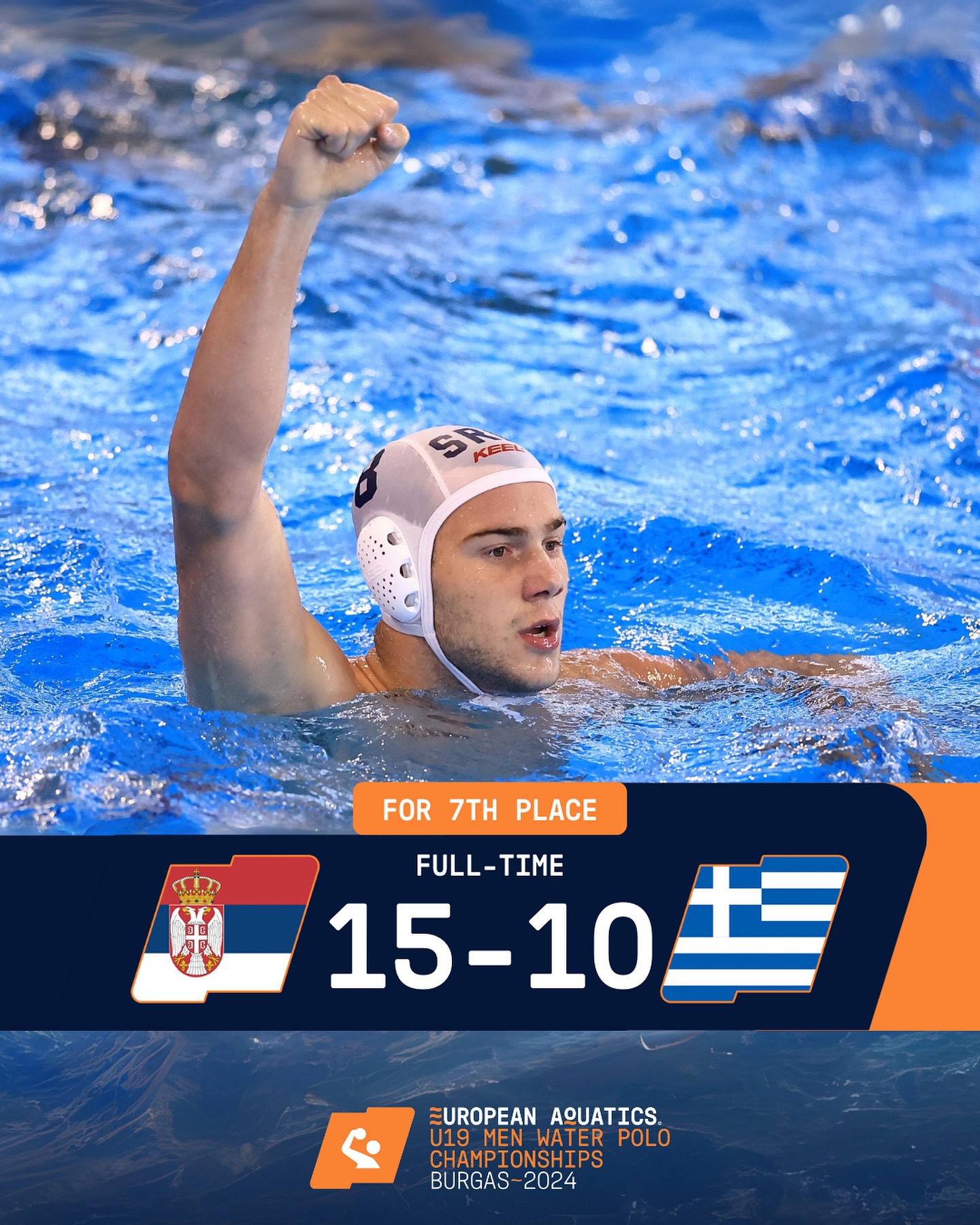 Την όγδοη θέση κατέλαβε η Εθνική μας ομάδα Υδατοσφαίρισης Νέων Ανδρών (Κ19) στο Ευρωπαϊκό πρωτάθλημα, το οποίο ολοκληρώνεται το Σάββατο (7/9) στο Μπουργκάς της Βουλγαρίας, αφού ηττήθηκε από τη Σερβία με 15-10.