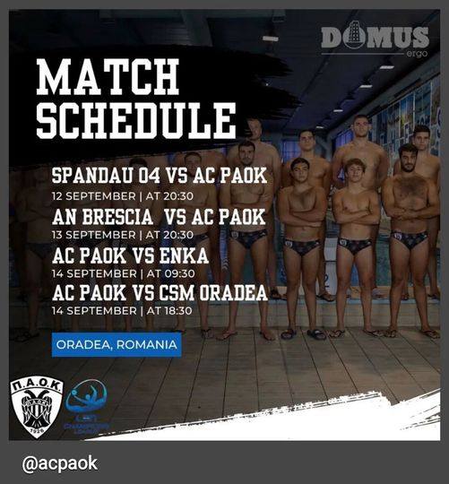 Για την πρώτη αγωνιστική του προκριματικού ομίλου του LEN Champions League, ο ΠΑΟΚ αντιμετωπίζει, στη Ρουμανία, την Πέμπτη 12 Σεπτεμβρίου και ώρα 20:30, την γερμανική, Σπαντάου.