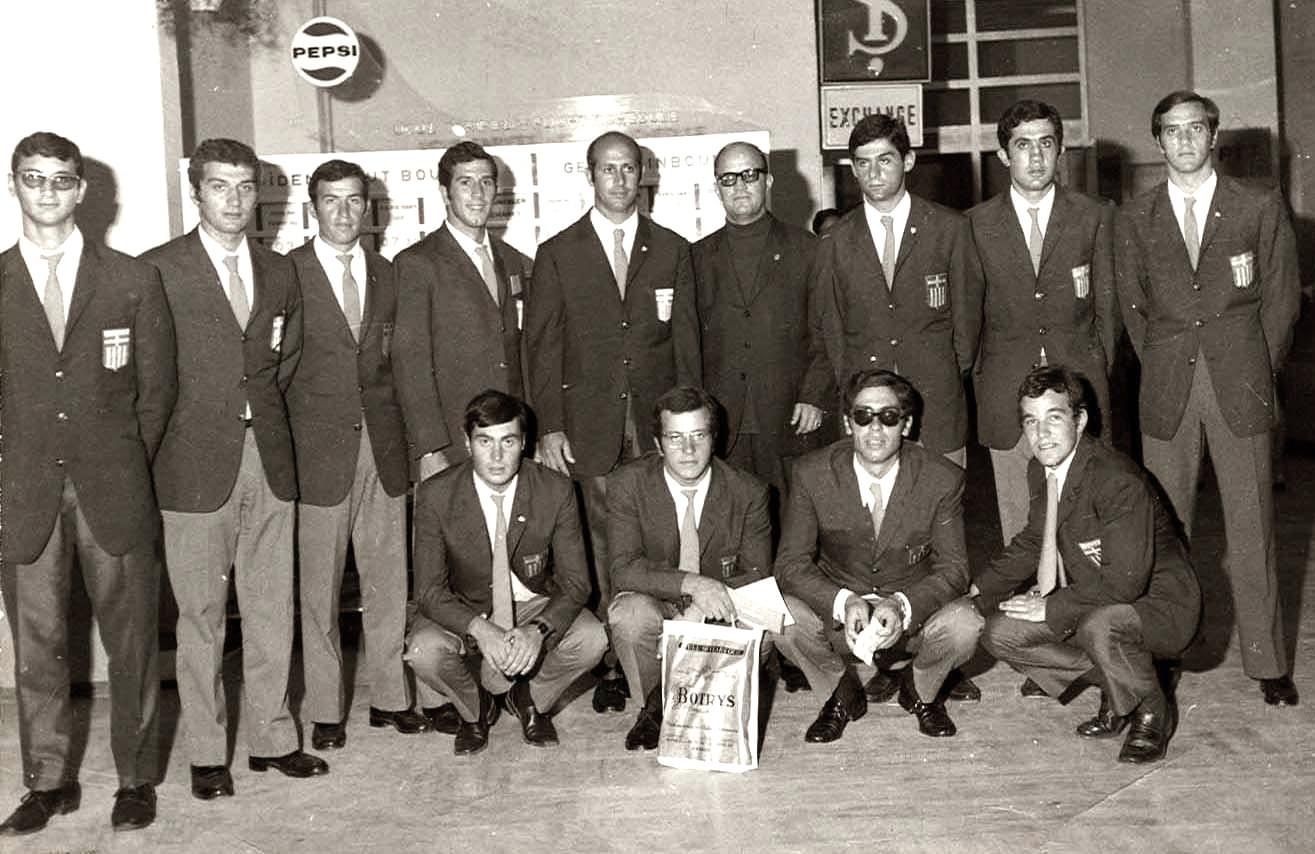 Όρθιοι από αριστερά: Πέτρος Χατζηκυριακάκης, Κούλης Ιωσηφίδης, Σωτήρης Τζαφόλιας, Τάκης Μίχαλος, Λίνο Ρεπέτο (προπονητής), Τζίμης Ηλιόπουλος (πρόεδρος ΚΟΕ-ΕΚΟΦ), Χρόνης Οικονόμου, Γιάννης Παληός, Γιώργος Θεοδωρακόπουλος.