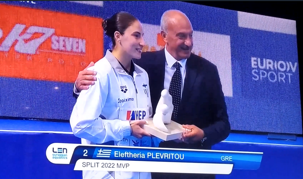 Μεγάλη διάκριση: η Ελευθερία Πλευρίτου αναδείχθηκε η πολυτιμότερη παίκτρια του ευρωπαϊκού πρωταθλήματος του Σπλιτ. Τη βράβευση έκανε ο πρόεδρος της Κολυμβητικής Ομοσπονδίας Ελλάδας και Α’ Αντιπρόεδρος της Ευρωπαϊκής Ομοσπονδίας, Κυριάκος Γιαννόπουλος.
