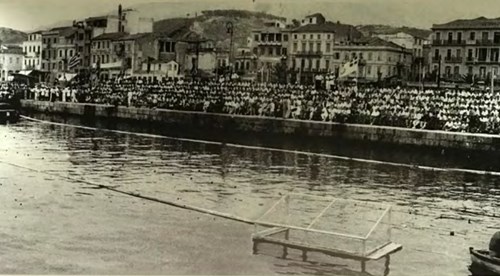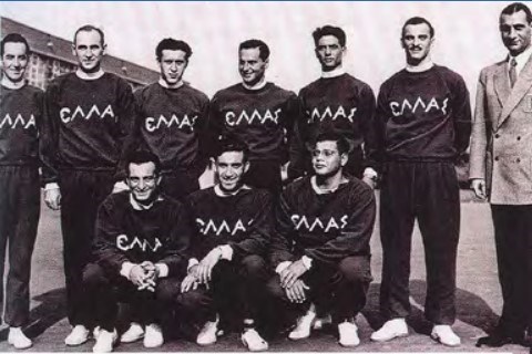 Η Εθνική ομάδα υδατοσφαίρισης το 1948 στο Λονδίνο με την παρουσία των παικτών του ΝΟΠ, Ντένη Σταμπουλή και Γιάννη Παπαστεφάνου, πέμπτος και έκτος όρθιος (από αριστερά).