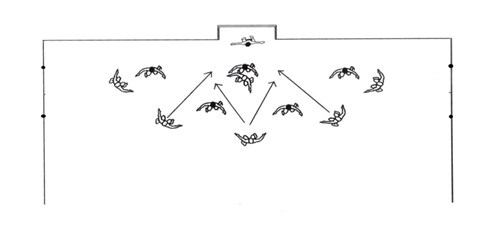 Με τις μετακινήσεις αυτές οι 6 επιθετικοί παίκτες, τοποθετούνται στο χώρο επίθεσης από τις δύο αρχικές γραμμές σε τρεις. Δύο παίκτες από τους 4 παίκτες της μπροστινής γραμμής επίθεσης στα δύο μέτρα, μετακινούνται μέσα ή έξω από αυτά. Κατ΄αυτόν τον τρόπο διαταράσσεται η άμυνα ζώνης στην πρώτη γραμμή, όπου οι 4 επιθετικοί δύσκολα μπορούν να μείνουν ελεύθεροι για σουτ απέναντι στους 3 αμυντικούς παίκτες, και προκύπτουν περιπτώσεις πιο εύκολες για σκοράρισμα, δύο επιθετικών έναντι ενός αμυντικού. Μετακινήσεις τέτοιες των επιθετικών της πρώτης γραμμής είναι: 1) Από την πλευρά της πάσας, του εξτρέμ της πάσας Νο 1 και του παίκτη στο δεύτερο δοκάρι Νο 5 μέσα στα δύο μέτρα. 2) Από την πλευρά του σούτ, του εξτρέμ του σουτ Νο 4 και του παίκτη στο πρώτο δοκάρι Νο 6, μέσα στα 2 μέτρα 3) Μετακίνηση των δύο εξτρέμ Νο 1 και Νο 4 μέσα στα 2 μέτρα και 4) Μετακίνηση των δύο εξτρέμ Νο 1 και Νο 4 έξω από τα δύο μέτρα. Παράδειγμα στο σχήμα όπου το εξτρέμ της