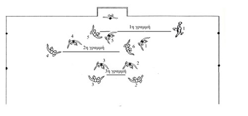 Σχ.-1γ Τρεις γραμμές επίθεσης με την είσοδο ταυτόχρονα του παίκτη από τη θέση Νο 1 και Νο 5 μέσα στα 2 μέτρα. Οι αμυντικοί καλύπτουν την πρώτη και τη δεύτερη γραμμή επίθεσης Περίπτωση παίκτη παραπάνω 2 επιθετικοί με 1 αμυντικό στην τρίτη γραμμή επίθεσης
