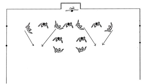 Σχ.-3. Τρεις γραμμές επίθεσης με την έξοδο ταυτόχρονα των δύο εξτέμ του παίκτη από τη θέση Νο 1 και Νο 4 έξω από τα 2 μέτρα, ενδιάμεσα από τους παίκτες της μπροστινής και της πίσω γραμμής. Οι αμυντικοί καλύπτουν τη δεύτερη και τρίτη γραμμή επίθεσης Περίπτωση παίκτη παραπάνω 2 επιθετικοί με 1 αμυντικό στη πρώτη γραμμή επίθεσης